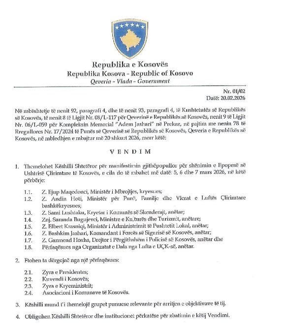 Sipas njoftimit zyrtar, me Vendimin Nr. 01/02, datë 20.02.2026, Qeveria e Republikës së Kosovës ka themeluar Këshillin Shtetëror për shënimin e 28-vjetorit të Epopesë së UÇK-së. Ky këshill kryesohet nga ministri i Mbrojtjes, Ejup Maqedonci, ndërsa bashkëkryesohet nga ministri për Punë, Familje dhe Vlera të Luftës Çlirimtare, Andin Hoti.