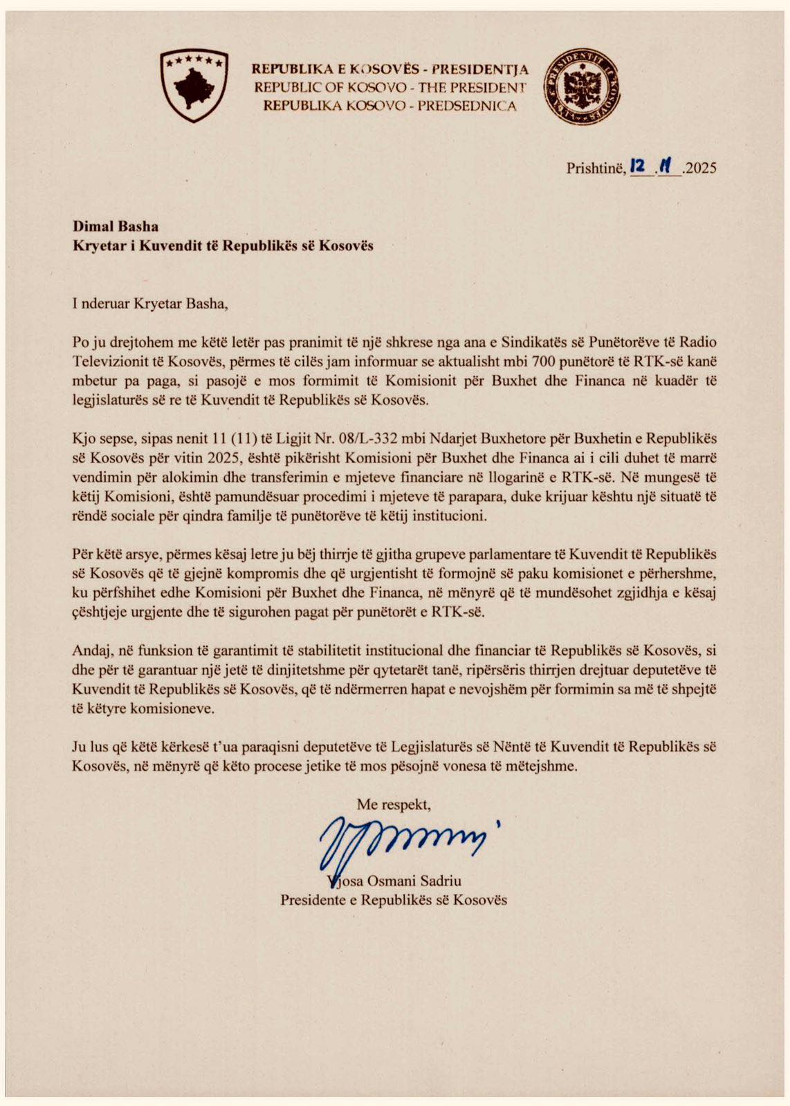Presidentja e Kosovës, Vjosa Osmani, ka dërguar një letër Kryetarit të Kuvendit, Dimal Basha, për të adresuar vonesat në pagesat e mbi 700 punëtorëve të Radio Televizionit të Kosovës, si pasojë e mosformimit të Komisionit për Buxhet dhe Financa në legjislaturën e re.