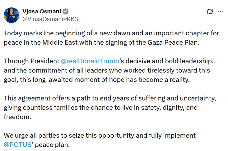Presidentja e Kosovës, Vjosa Osmani, ka përshëndetur nënshkrimin e `Planit të Paqes` për Gazën, duke e konsideruar këtë fillim të një kapitulli të rëndësishëm për paqen në Lindjen e Mesme, përcjell KosovaPost.