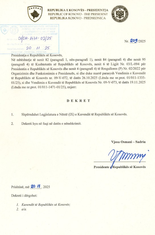 Presidentja e Kosovës, Vjosa Osmani, ka shpërndarë sot Kuvendin e Republikës së Kosovës, pas konfirmimit zyrtar nga Kuvendi se edhe mandatari i dytë ka dështuar të krijojë Qeverinë. Vendimi është marrë në përputhje me Kushtetutën dhe legjislacionin në fuqi, ndërsa shënon përfundimin e Legjislaturës së nëntë.