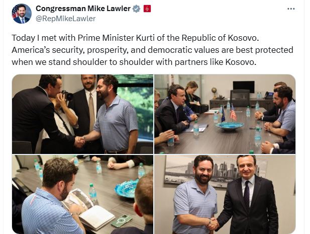 “Sot u takova me kryeministrin e Republikës së Kosovës, Albin Kurti. Siguria, prosperiteti dhe vlerat demokratike të Amerikës mbrohen më së miri kur qëndrojmë krah për krah me partnerë si Kosova”, ka shkruar Lawler.