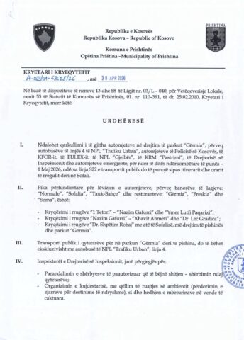 Në një njoftim zyrtar, Komuna bën me dije se përjashtim nga ky vendim bëjnë autobusët e linjës 4 të Trafikut Urban, automjetet e policisë, KFOR-it dhe EULEX-it, automjetet emergjente dhe të inspektoratit, si dhe ndërmarrjet “Gjelbër” dhe “Pastrimi”.