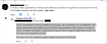 “Ne po mundohemi me kriju lehtesira dhe siguri per investitore. Po mundohemi me i pastru edhe deponite ilegale qe po krijohen nga qytetaret. Kemi caktuar vendin ku duhet te hidhen (dysheke e joga) pervec tjerave. Kemi treguar edhe kend duhet me thirr per me bo bartjen e tyre!!!Per bese, kurse te sjelljes ne qytet nuk po mundemi me mbajt!!”, ka shkruar Rama në koment.