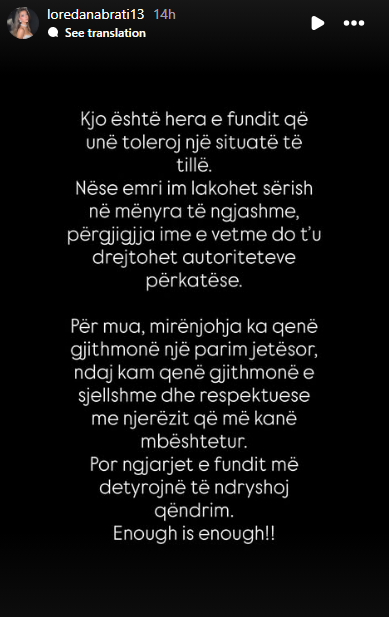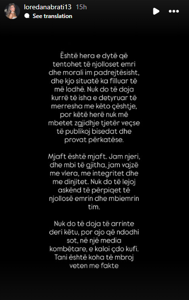 Në një seri postimesh në “Instastory”, Loredana ka sqaruar versionin e saj të ngjarjeve, duke theksuar se ndjen nevojën të mbrojë integritetin dhe reputacionin e saj pas, siç e quan ajo, “përpjekjeve të përsëritura për ta njollosur padrejtësisht”.