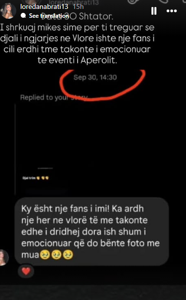 Pas deklaratës, Loredana publikoi edhe një foto të bisedës me një mikeshë, për të sqaruar se i riu nga Vlora ishte thjesht një fans, e jo dikush me të cilin kishte ndonjë lidhje.