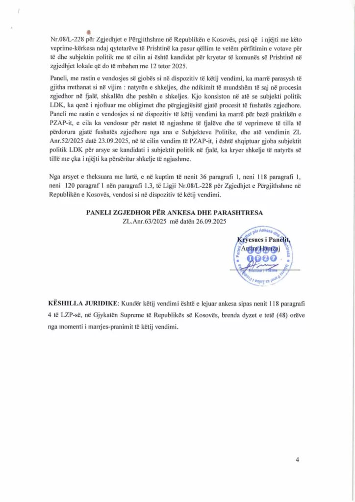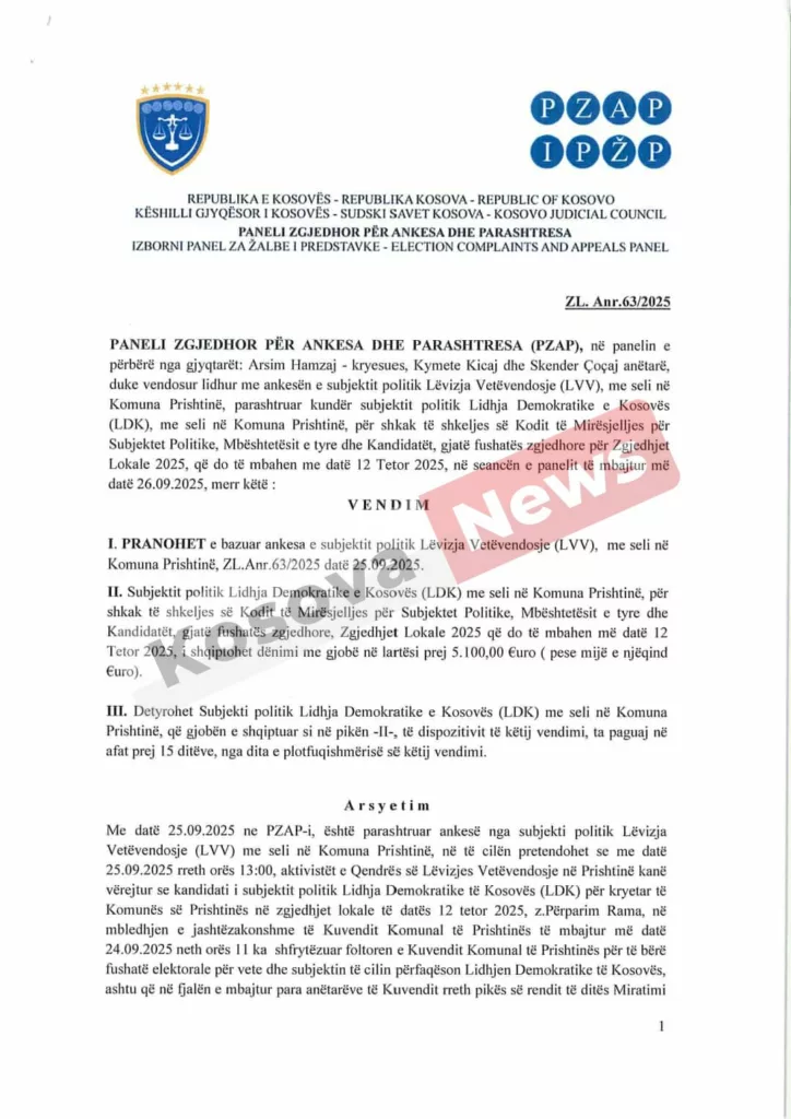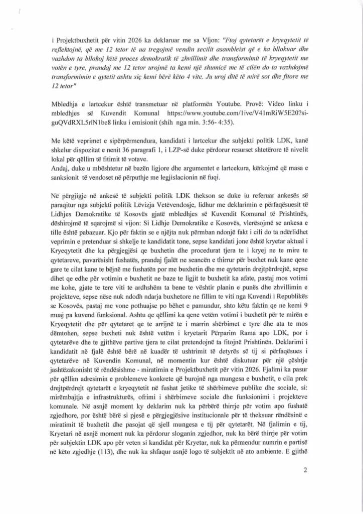 Vendimi erdhi pas ankesës së Lëvizjes Vetëvendosje (LVV), e cila akuzoi kandidatin e LDK-së për kryetar të Prishtinës, Përparim Rama, se më 24 shtator 2025 ka përdorur mbledhjen e jashtëzakonshme të Kuvendit Komunal të Prishtinës për të bërë thirrje elektorale në favor të subjektit të tij politik.