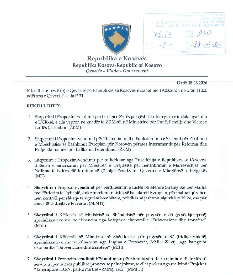 Sipas njoftimit zyrtar nga Zyra e Kryeministrit, ekzekutivi do të shqyrtojë një sërë propozim-vendimesh me rëndësi institucionale dhe zhvillimore. Ndër çështjet kryesore është bartja e Zyrës për çështjet e kategorive të dala nga lufta e UÇK-së nga kuadri i ZKM-së në Ministrinë për Punë, Familje dhe Vlerat e Luftës Çlirimtare.