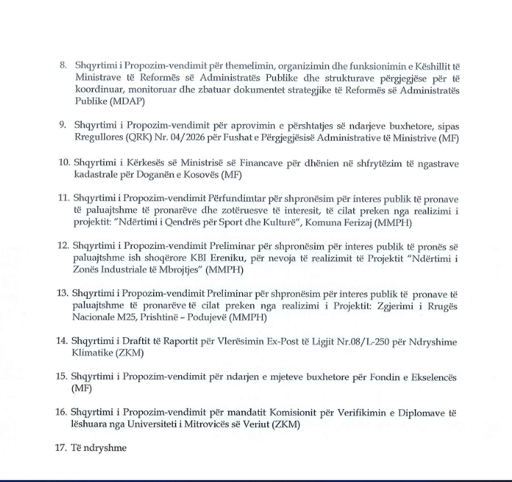 Në mesin e pikave të tjera është edhe shqyrtimi preliminar për shpronësimin për interes publik të pronave të prekura nga projekti i zgjerimit të rrugës nacionale M25, në segmentin Prishtinë–Podujevë, si dhe çështje që lidhen me mandatin e Komisionit për verifikimin e diplomave të lëshuara nga Universiteti i Mitrovicës së Veriut.