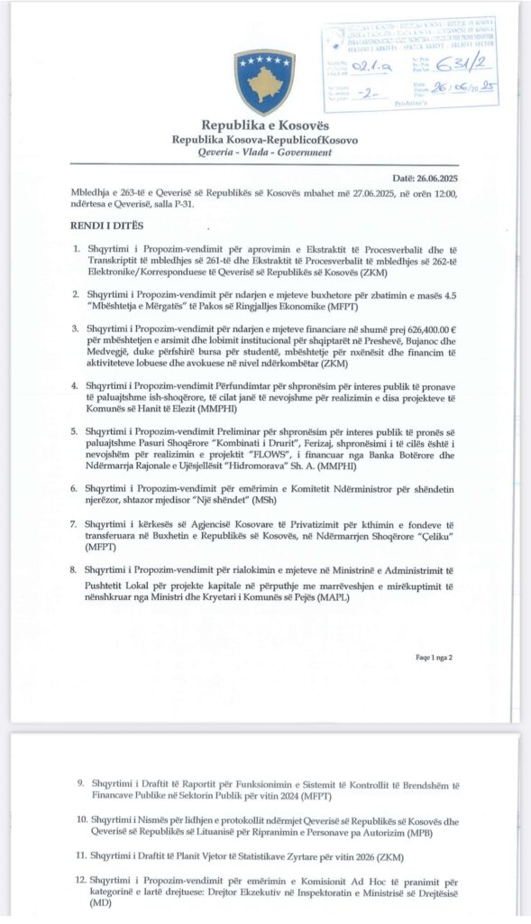 Nesër (e premte), më 27.06.2025, në orën 12:00, në ndërtesën e qeverisë, sallën P-31, nën udhëheqjen e kryeministrit në detyrë, Albin Kurtit, do të mbahet mbledhja e 263-të e Qeverisë së Republikës së Kosovës.