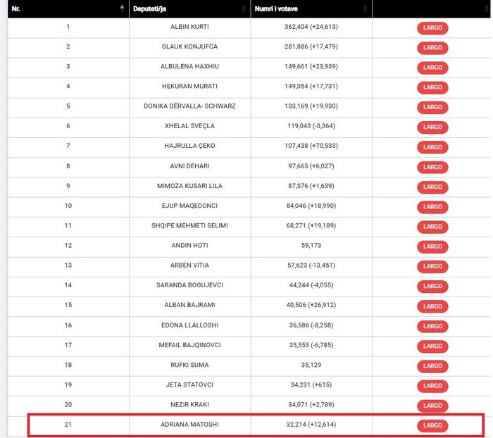 Sipas rezultateve aktuale, Lëvizja Vetëvendosje pritet të ketë 56 deputetë në Kuvend, ndërsa Adriana Matoshi renditet aktualisht si e 21-ta më e votuara në listën e kësaj partie.