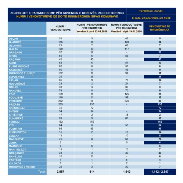 “Nga fillimi i këtij procesi (e martë, 13 janar 2026, ora 18:00) dhe deri më tani (e enjte, 22 janar 2026, ora 16:00) janë rinumëruar rreth 45% apo 1,142 nga 2,557 vendvotime”, ka thënë zëdhënësi i KQZ-së, Valmir Elezi.