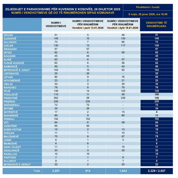 “Nga fillimi i këtij procesi (e martë, 13 janar 2026, ora 18:00) dhe deri më tani (e enjte, 29 janar 2026, ora 16:00) janë rinumëruar mbi 90% apo 2,329 nga 2,557 vendvotime. Pra, numri i përgjithshëm i komunave që deri më tani kanë përmbyllur rinumërimin janë 34, ndërkaq kanë mbetur për t’u rinumëruar edhe 228 vendvotime që i takojnë 4 komunave tjera (Podujevë, Prishtinë, Shtërpcë dhe Suharekë)”, ka njoftuar zëdhënësi i KQZ-së, Valmir Elezi.