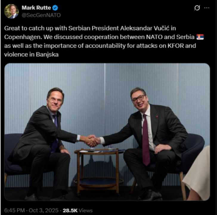 “Ishte kënaqësi të takohesha me presidentin serb Aleksandër Vuçiq në Kopenhagë. Diskutuam bashkëpunimin midis NATO-s dhe Serbisë, si dhe rëndësinë e llogaridhënies për sulmet ndaj KFOR-it dhe dhunën në Banjskë”, ka shkruar ai.