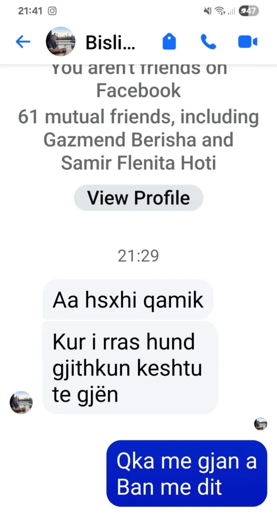 “Sapo më shkroi në mesazhe private e më kercënoi pa nevojë, ish shoferi i ish ministrit Avdullah Hoti, aktualisht deputet i Kuvendit të Kosovës. I trimëruar nga dhuna në shesh, më paralajmëron që nëse un i futi hundët gjithkah do më gjen njëjti fat.