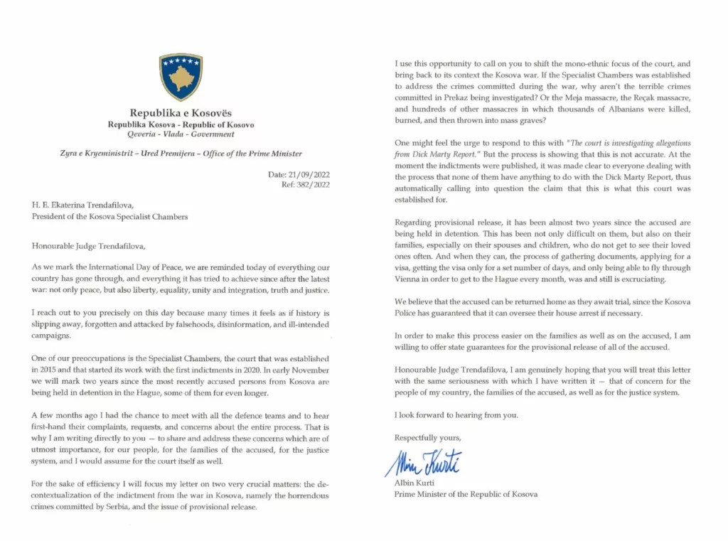 Lidhur me rastin, Kurti publikoi edhe një letër zyrtare
