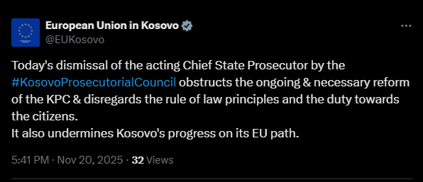 “Shkarkimi i sotëm i Kryeprokurorit të Shtetit në detyrë nga Këshilli Prokurorial i Kosovës (#KosovoProsecutorialCouncil) pengon reformën e vazhdueshme dhe të domosdoshme në KPK, si dhe shpërfill parimet e sundimit të ligjit dhe detyrimin ndaj qytetarëve.