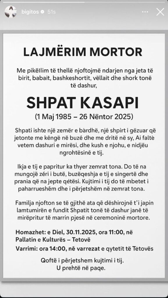 Homazhet për nder të Shpat Kasapit, i cili kujtohet si “një zemër e bardhë, një shpirt i gëzuar”, do të mbahen nesër, sipas këtij orari: