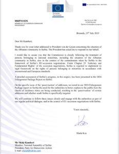 Sot, në adresën e deputetit Kamberi ka ardhur edhe letra tjetër nga Marta Kos, Komisionere e Bashkimit evropian për zgjerim, nëpërmjet një letre të dërguar, siguron se BE po e përcjellë nga afër trajtimin e pakicave dhe pozitën e tyre në Serbi dhe konfirmon se Kapitulli i 23 është i rëndësishëm për rrugëtimin e Serbisë drejtë BE-së!