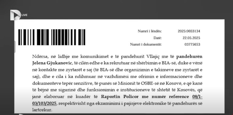 Në këtë dokument, dy faqesh nuk jepet asnjë detaj më shumë sesa që ishte njoftimi i PSRK-së, që tregonte se e njëjta kishte siguruar dhe ka shpërndarë dokumente dhe informacione të ndjeshme për Agjencinë e Inteligjencës dhe Sigurisë të Republikës së Serbisë.