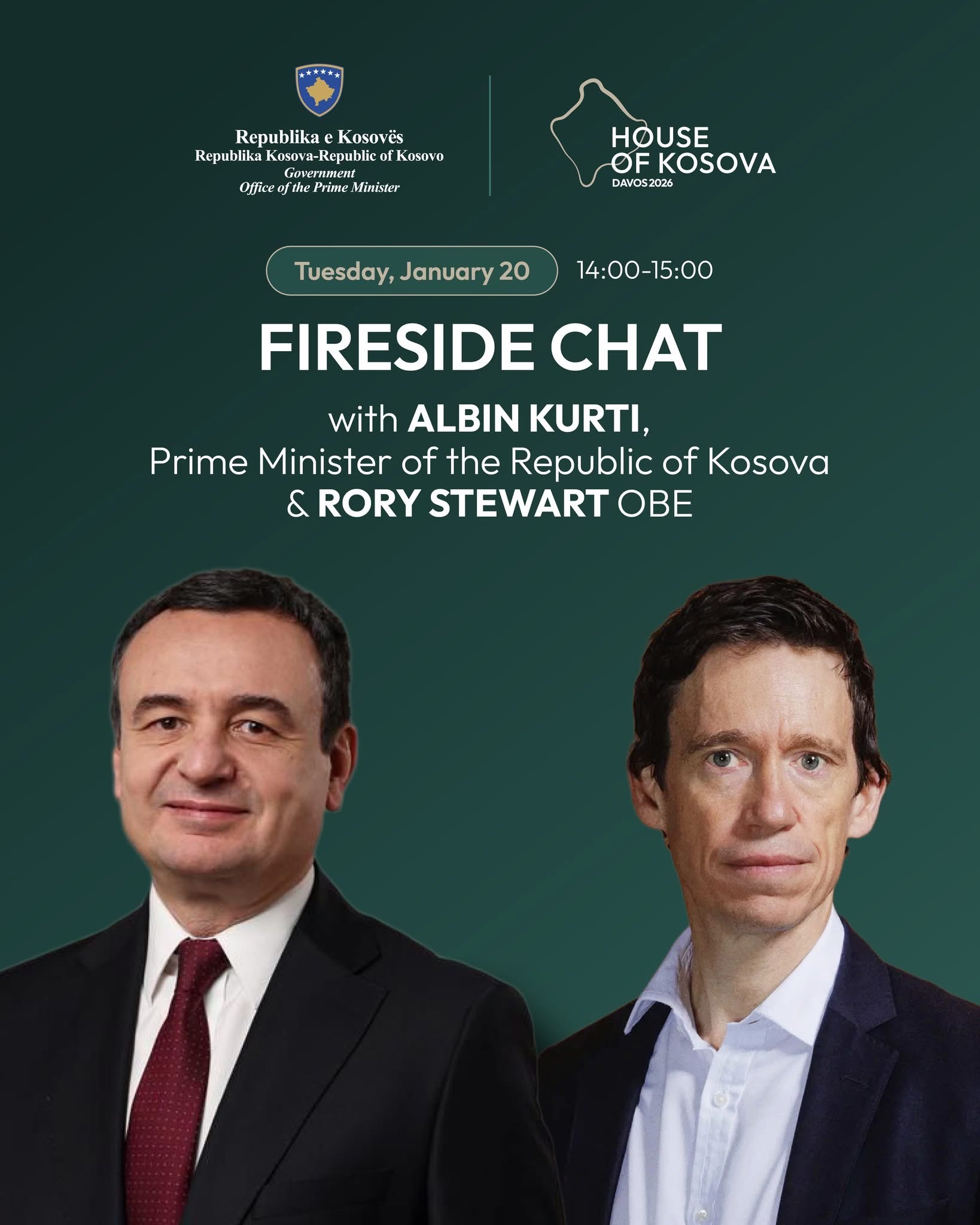 “Një bisedë që bashkon Albin Kurtin, Kryeministër i Republikës së Kosovës, dhe Rory Stewart OBE, për një shkëmbim të hapur mbi udhëheqjen, demokracinë, Kosovën dhe çështjet globale”, njofton Shtëpia e Kosovës.