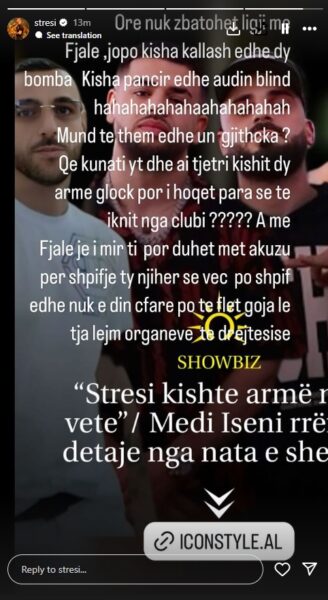 “Ore nuk zbatohet ligji me fjalë, jo po kisha kallash edhe dy bomba. Kisha pancir dhe Audi-në blind hahahaha. Mund të them unë gjithçka? Që Kunati yt dhe ai tjetri kishit dy armë glock por i hoqët para se të iknit nga klubi? A me fjalë je i mirë ti, por duhet me të akuzu për shpifje ty një herë se veç po shpif edhe nuk e din çfarë po të flet goja, le t’ia lejmë organeve të drejtësisë”, ka shkruar reperi në InstaStory.