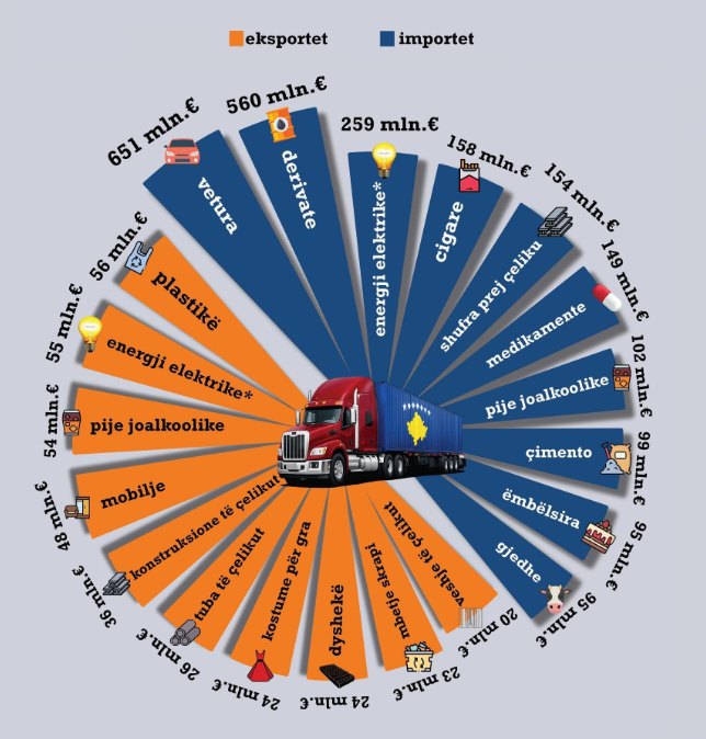 Importet më të mëdha përfshijnë veturat me vlerë rreth 651 milionë euro, të ndjekura nga derivatet me 560 milionë euro dhe energjia elektrike me 259 milionë euro, sipas të dhënave të publikuara nga Instituti GAP, referuar në statistikat e Doganës së Kosovës.