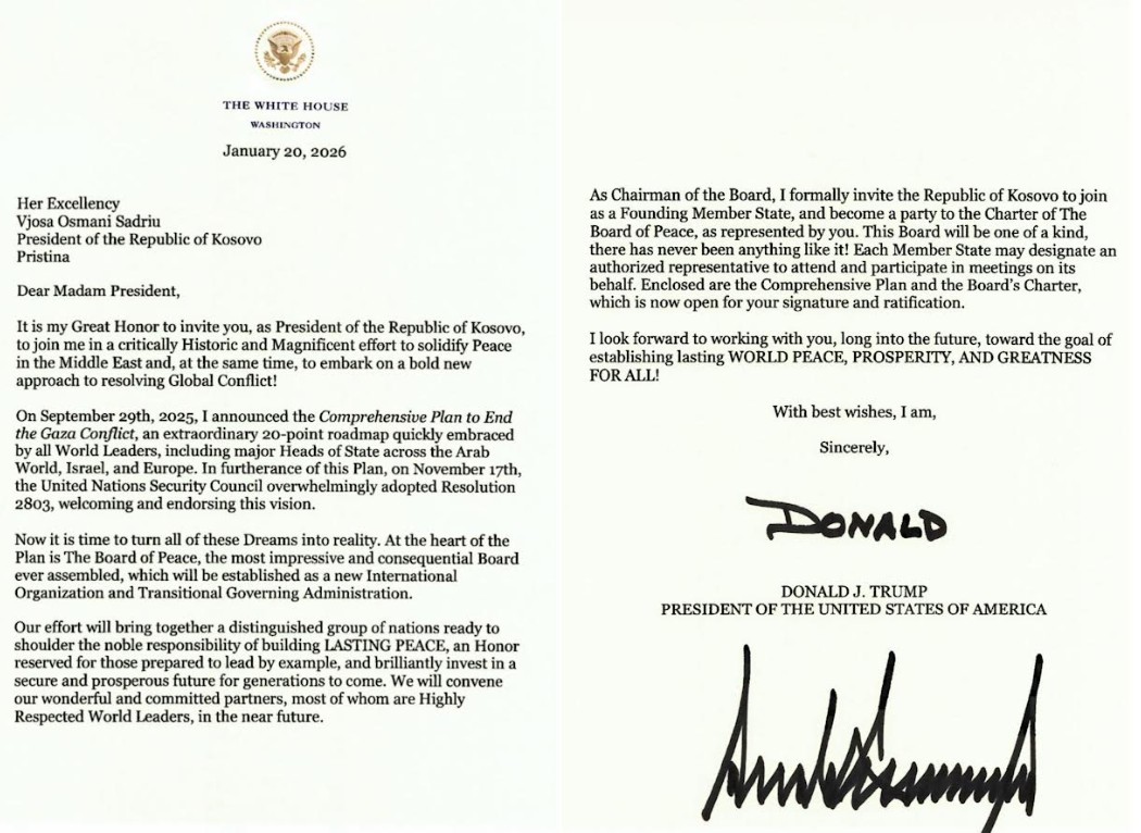 Presidentja e Republikës së Kosovës, Vjosa Osmani, ka pranuar një ftesë nga Presidenti i Shteteve të Bashkuara të Amerikës, Donald Trump, për ta përfaqësuar Republikën e Kosovës në Bordin e Paqes.