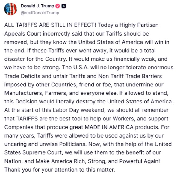 “Ata sot, si një Gjykatë Apeli shumë e politizuar, gabimisht tha se tarifat tona duhet të hiqen, por ata e dinë që Shtetet e Bashkuara të Amerikës do të fitojnë në fund”, shkroi ai.