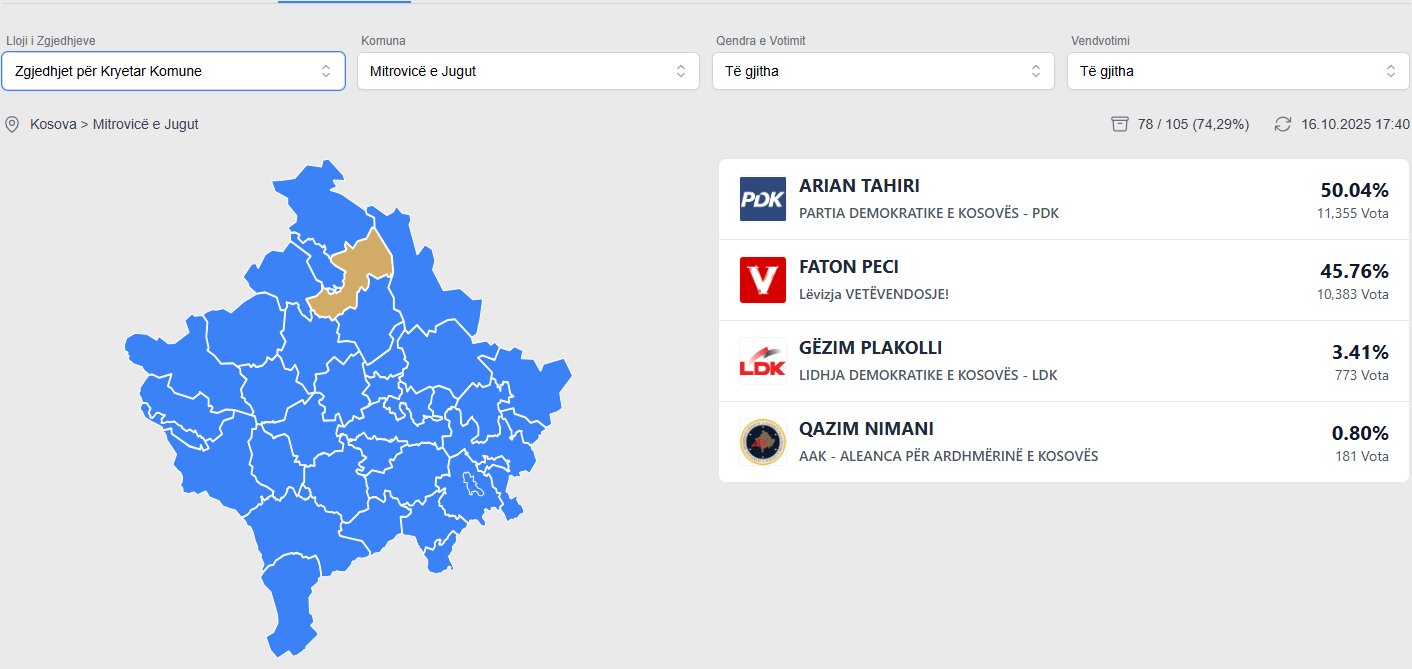 Bazuar në rezultatet e përditësuara të KQZ-së, në garën për kryetar të Mitrovicës, prin Arian Tahiri i PDK-së me 50.04% të votave të fituara, derisa pas tij, Faton Peci i VV-së, me 45.76%.