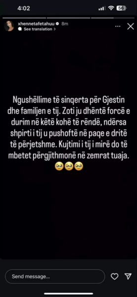 Xheneta Fetahu, ish banorja e Big Brother Vip Kosova 4 që pati një lidhje me Gjestin brenda shtëpisë, ka reaguar përmes një postimi në rrjetet sociale, ku i ka dërguar fjalë ngushëllimi Gjestit dhe familjes së tij në këtë moment të rëndë.